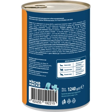 Вага упаковки - 1.24 кг, Призначення - основне годування, Клас - економ, Вік - для дорослих собак, Розмір породи - всі розміри, велика, середня, маленька, Тип упаковки - консервна банка, Країна-виробник товару - УкраїнаВиробник | М'ясна Миска |